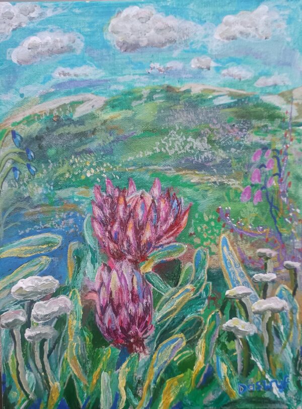 Playful Proteas – Inspired by the raw beauty of De hoop Nature reserve! One of 4 paintings in the Witsand collection. The sand really is a pure surreal white colour and the area just bursts with biodiversity. The 4 paintings of this collection were created around a campfire in the nature reserve. An overhead camp-lantern, the light of the fire and the night sky illuminated these paintings – and I do feel that the wonder and beauty of the area and that particular moment were captured in this collection.