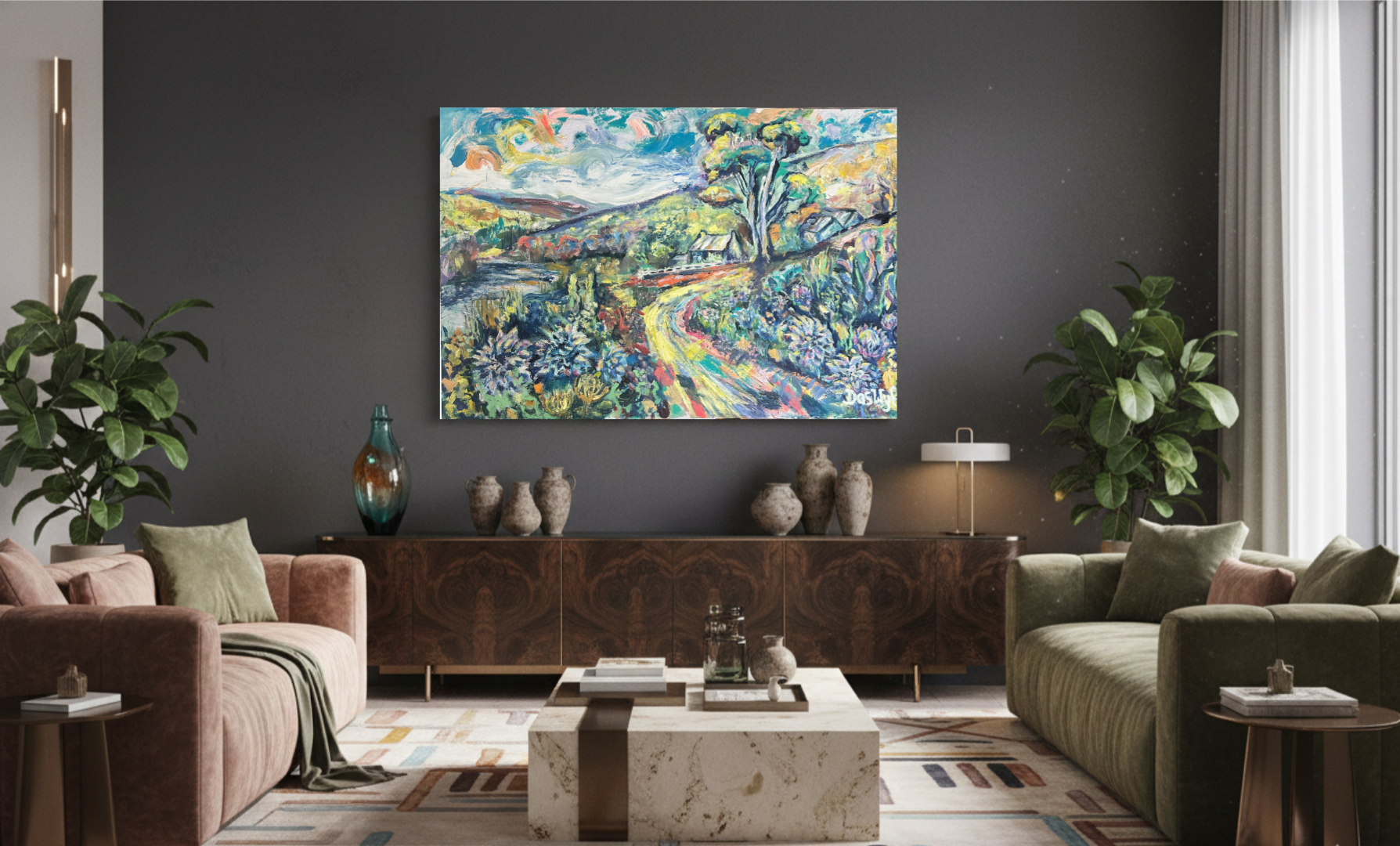 I wanted to capture the contrast of the Western Cape: the wild, resilient Fynbos and Proteas growing alongside the soft, layered faces of Dahlias. It’s a mix of the garden and the veld, tied together by a winding yellow track that pulls you deep into the valley.