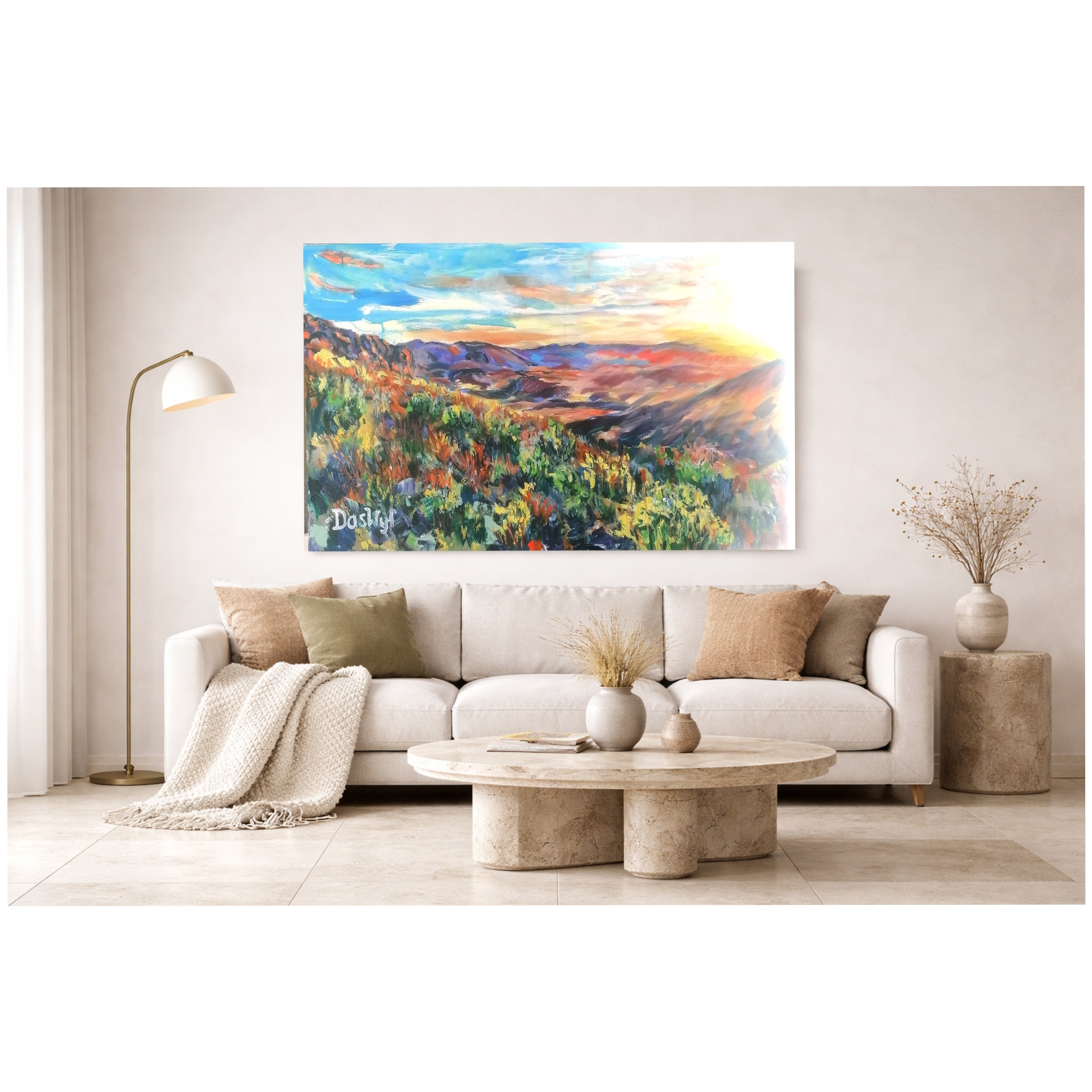 This large-scale landscape captures the Gamka Mountains in the final moments of daylight, when the land settles and colour softens. Earth-driven tones of ochre, rust, olive, and deep green speak to the region’s biodiversity, while the sky unfolds in layered cerulean blues, warm greys, and subtle peach light from the setting sun.